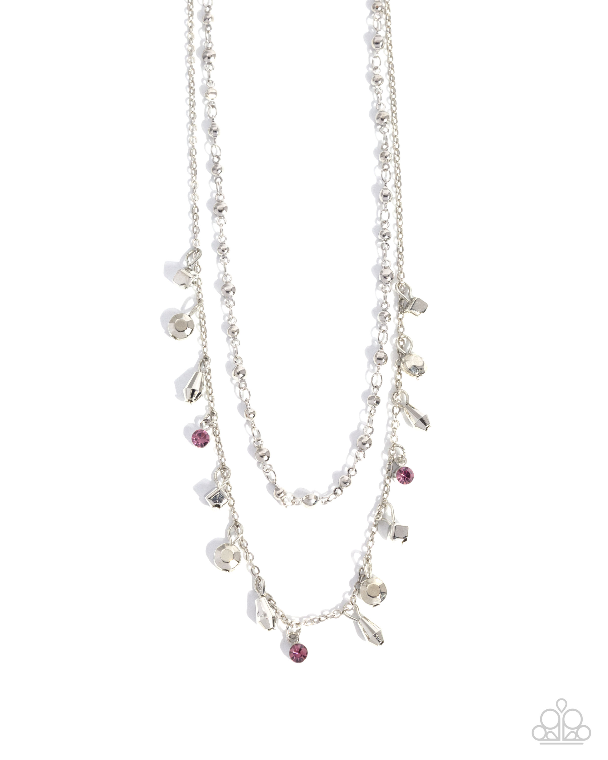 Layering with a silver satellite chain, a dainty silver chain with swaying silver cubes, cylinders, smashed faceted beads, and light amethyst rhinestones coalesces below the neckline for an attention-grabbing look. Features an adjustable clasp closure.